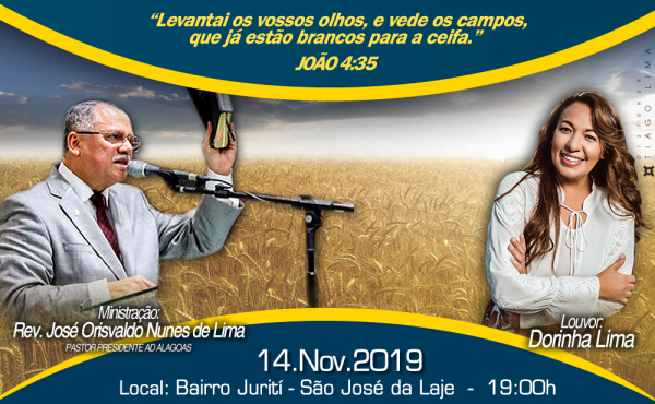 O pastor-presidente Rev. José Orisvaldo Nunes de Lima será o preletor do culto e a cantora Dorinha Lima estará abrilhantando a noite com hinos de adoração a Deus. A cruzada terá como tema: “Levantai os vossos olhos, e vede os campos, que já estão brancos para a ceifa”, inspirado no evangelho de São João (4.35). Convide uma pessoa não crente e venha participar deste grande culto dedicado ao Senhor!